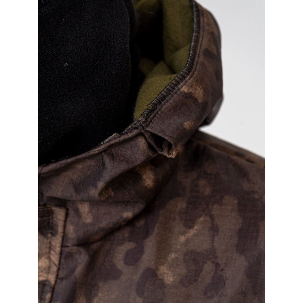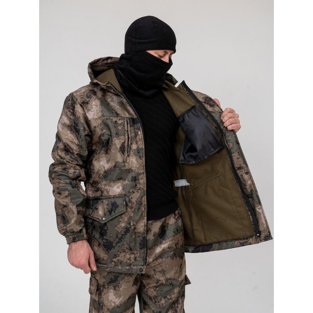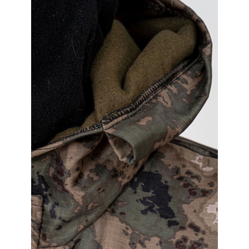 - Куртка: однотонная трикотажная дышащая ткань (95% хлопок, 5% спандекс) для туловища и камуфляжная прочная ткань (65% полиэстер, 35% хлопок) для рукавов.