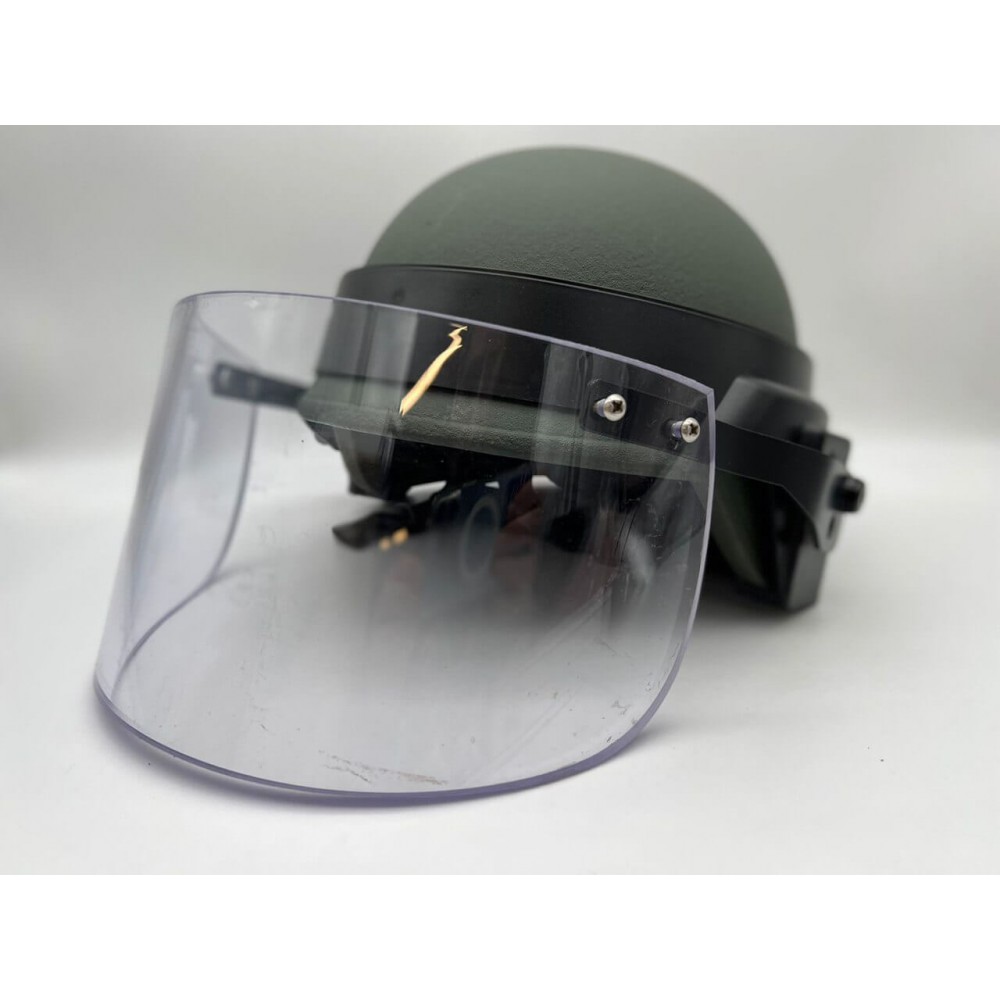 Защитный шлем изготовлен из композитного материала на основе 19 слоев арамида и СВМПЭ со специальной пропиткой фенольными смолами. Забрало защищает от попадания пистолетных пуль и осколков. Соответствует классу защиты NIJ IIIA. Толщина защитного экрана – 8 мм.